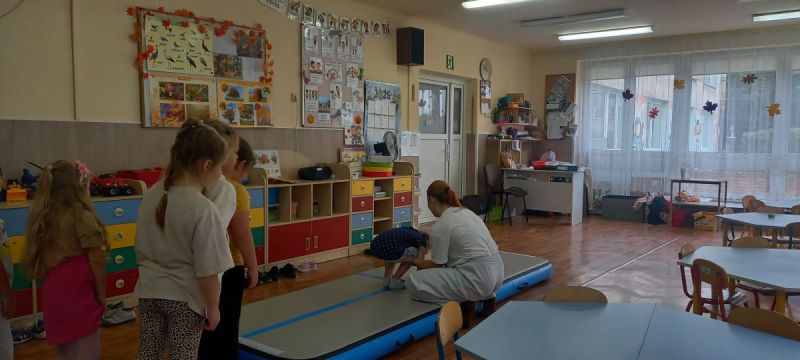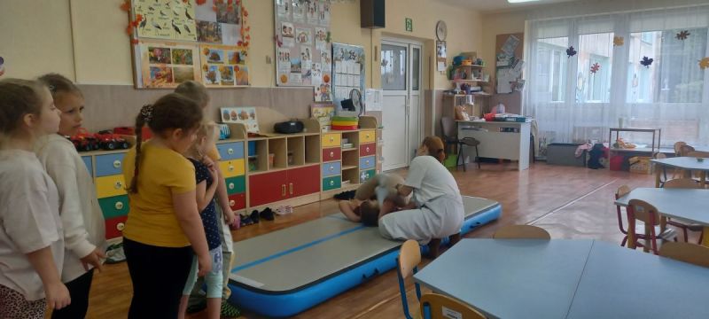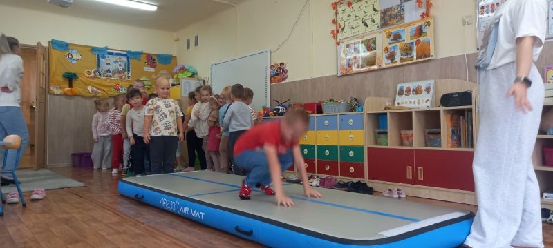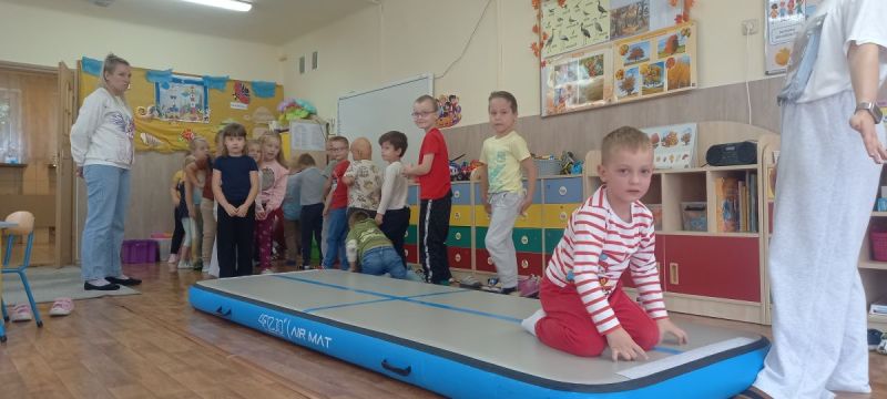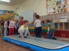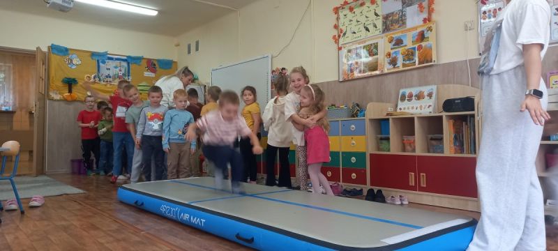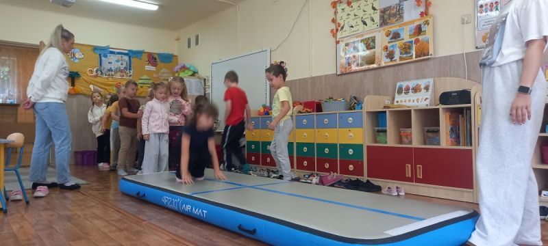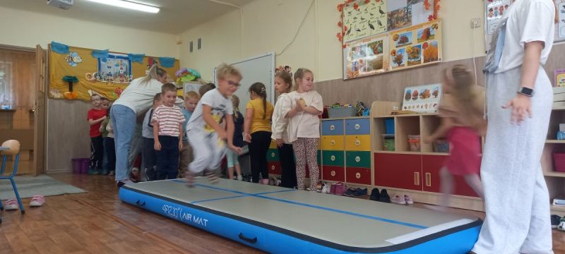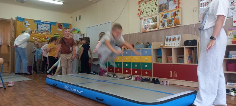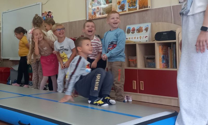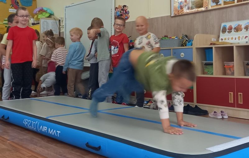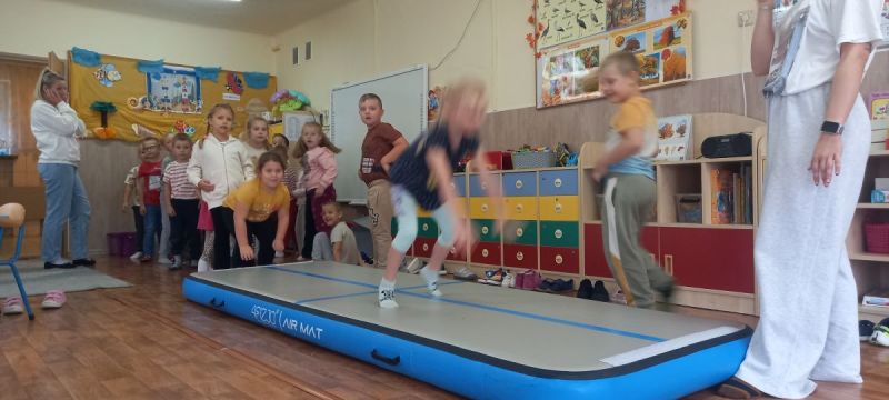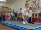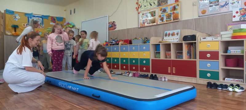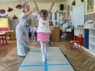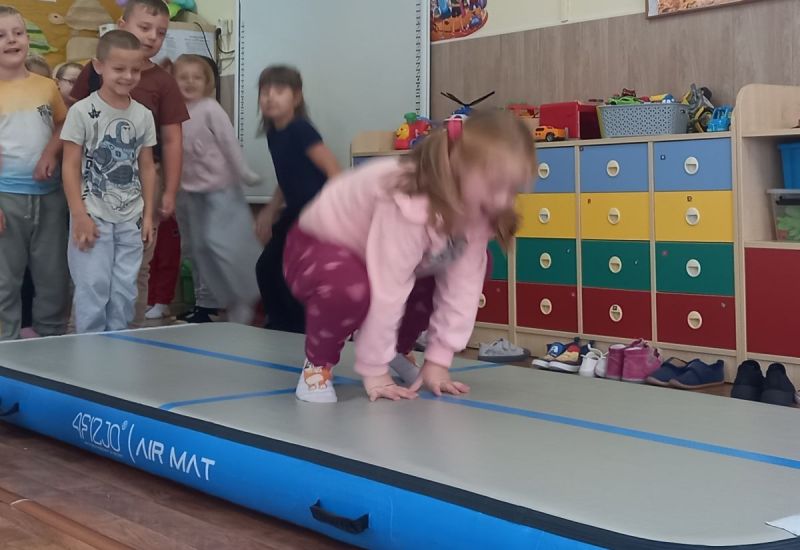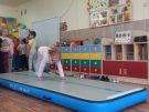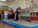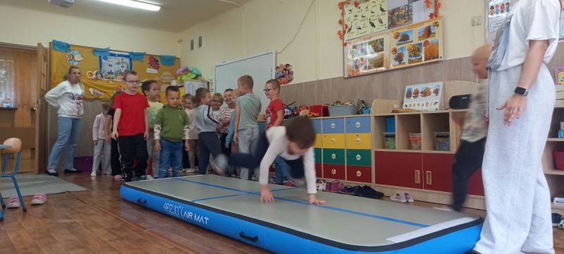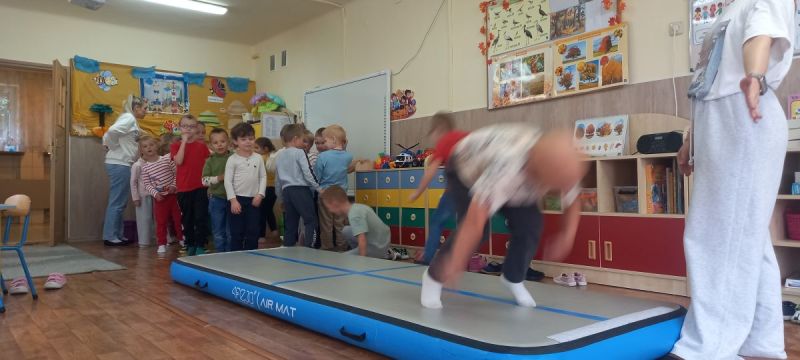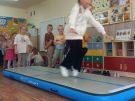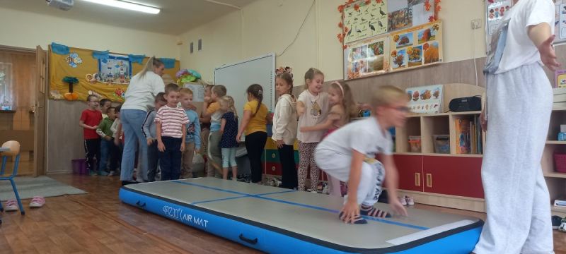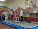We wtorek 23.wrzesnia dzieci z przedszkola miały zajęcia pokazowe prowadzone przez profesjonalną nauczycielkę gimnastyki i akrobatyki. Dzieci poprzez zabawę na materacu przekonały się o odlotowej przyjemności z ćwiczeń gimnastycznych.