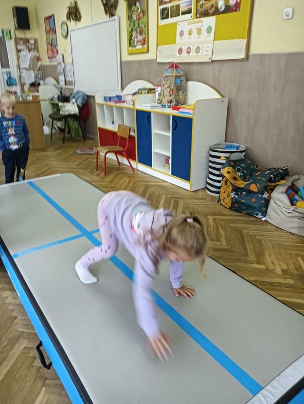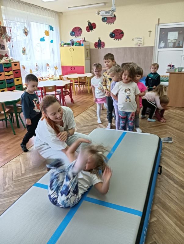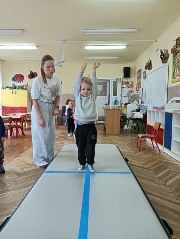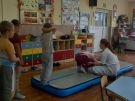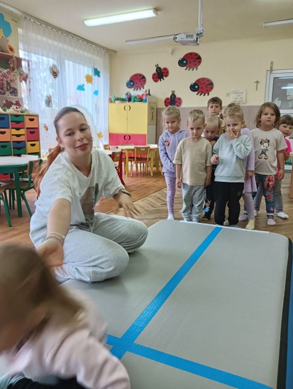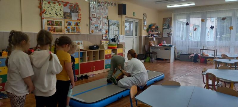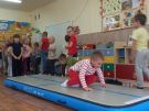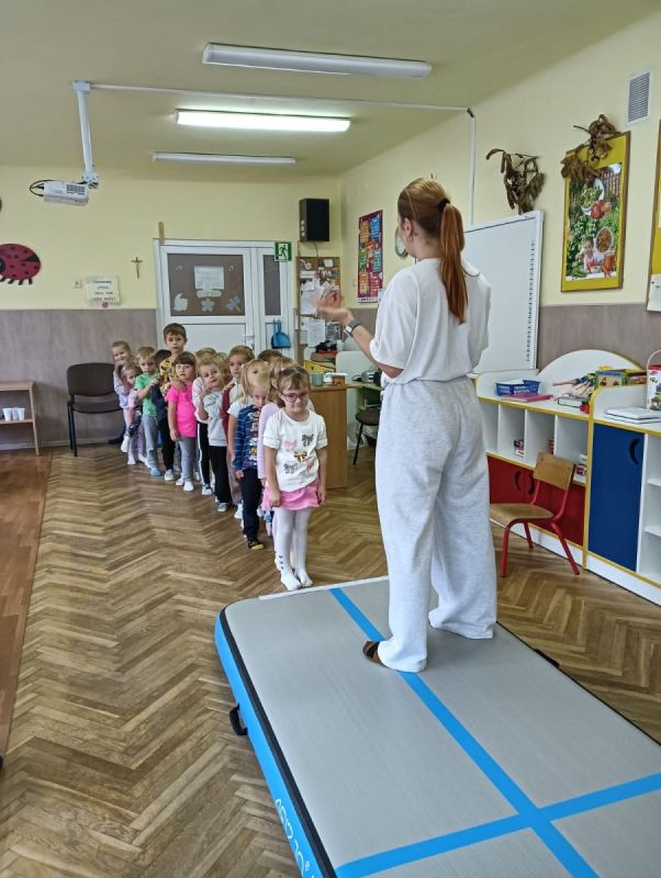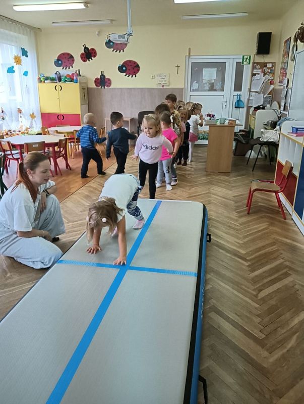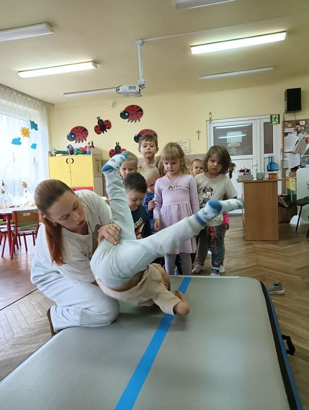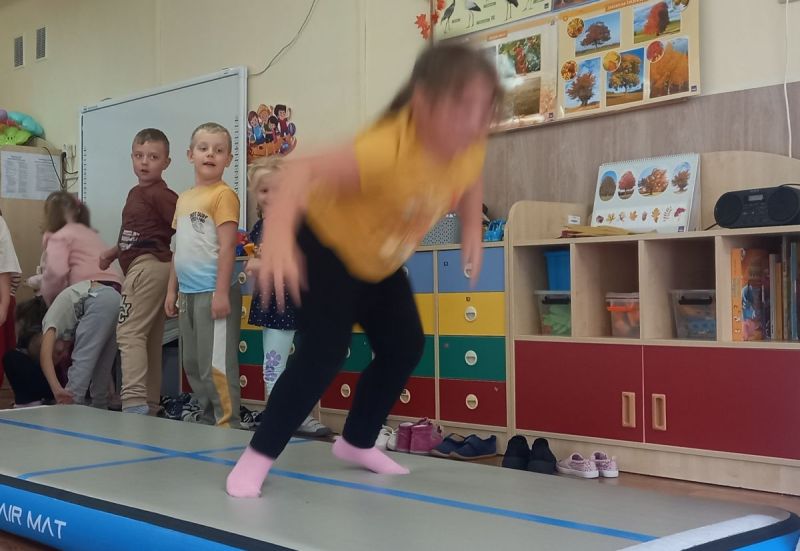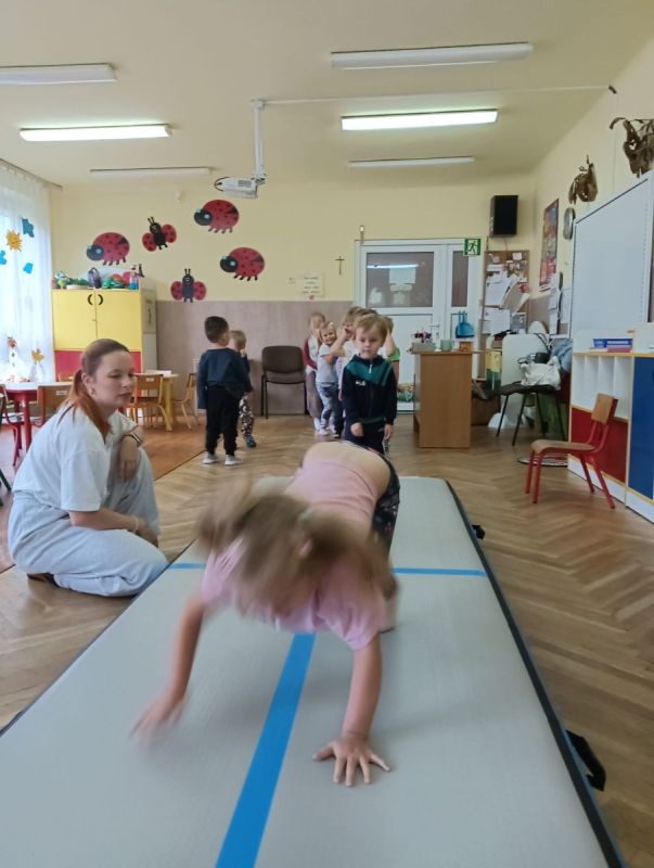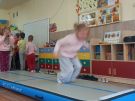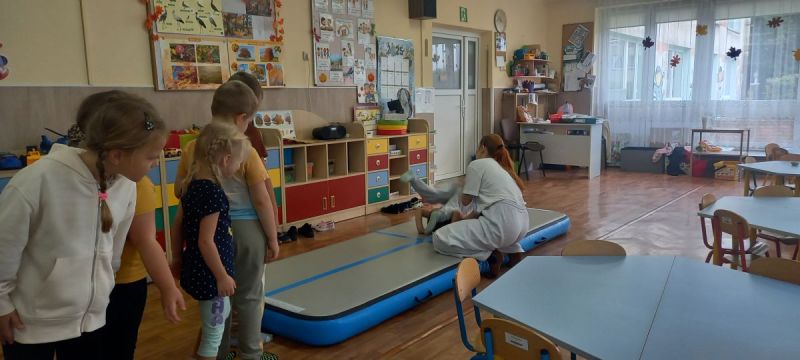 We wtorek 23.wrzesnia dzieci z przedszkola miały zajęcia pokazowe prowadzone przez profesjonalną nauczycielkę gimnastyki i akrobatyki. Dzieci poprzez zabawę na materacu przekonały się o odlotowej przyjemności z ćwiczeń gimnastycznych.