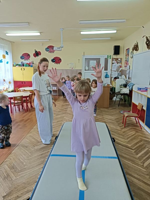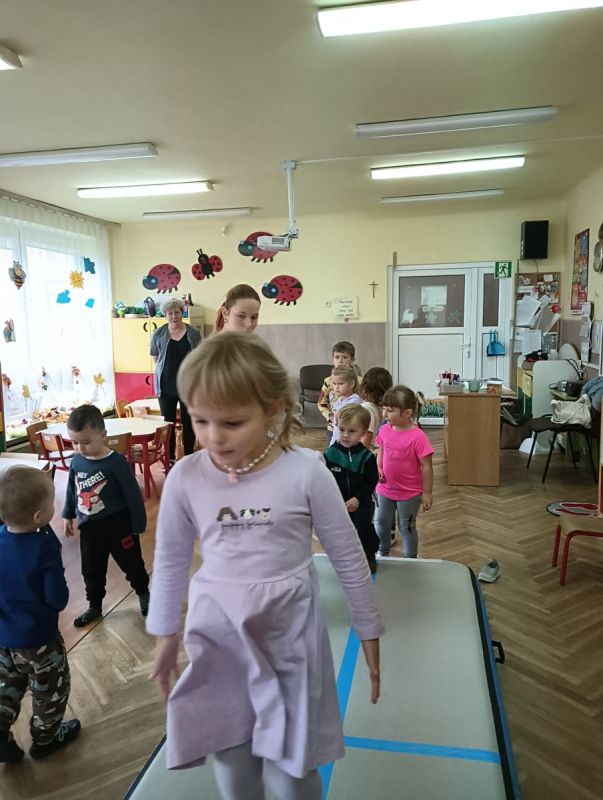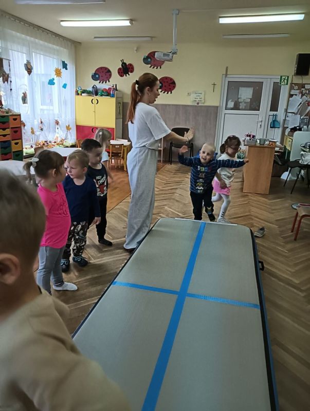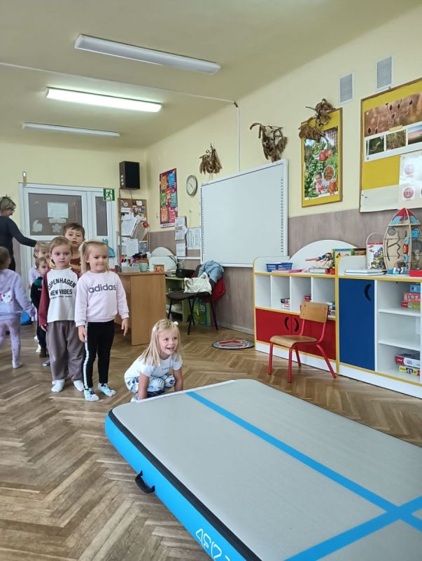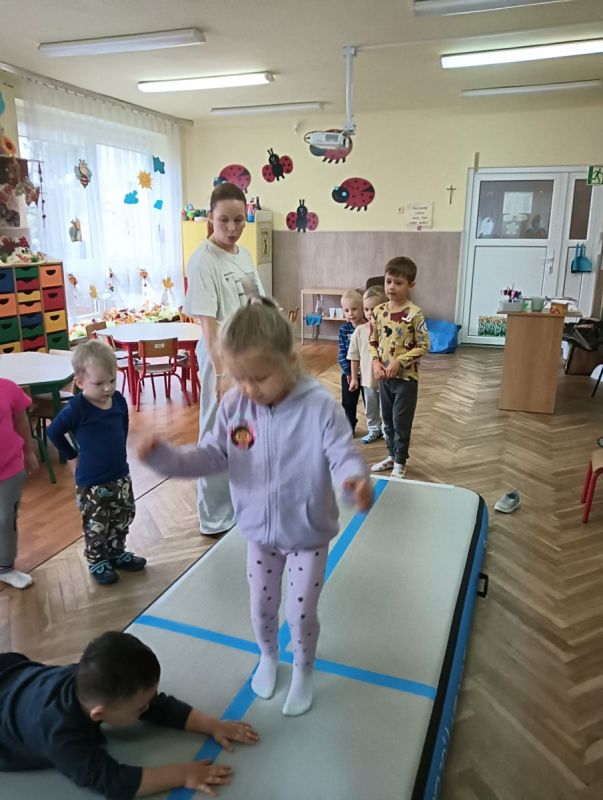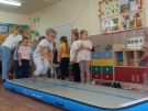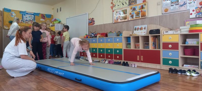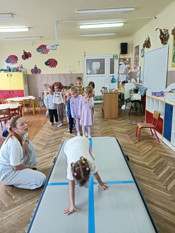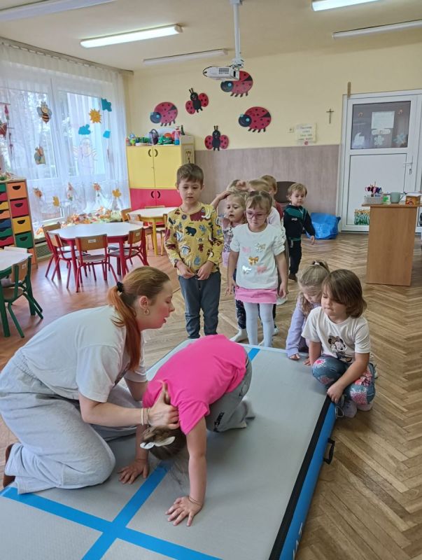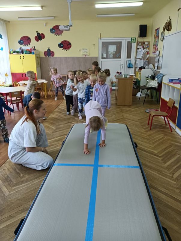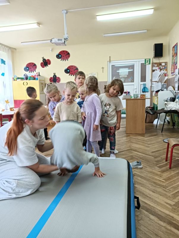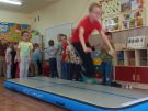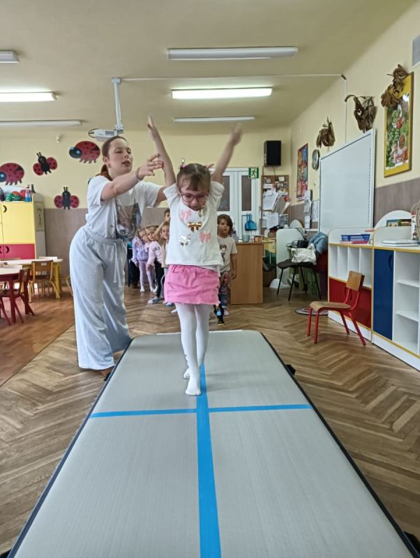 We wtorek 23.wrzesnia dzieci z przedszkola miały zajęcia pokazowe prowadzone przez profesjonalną nauczycielkę gimnastyki i akrobatyki. Dzieci poprzez zabawę na materacu przekonały się o odlotowej przyjemności z ćwiczeń gimnastycznych.