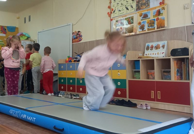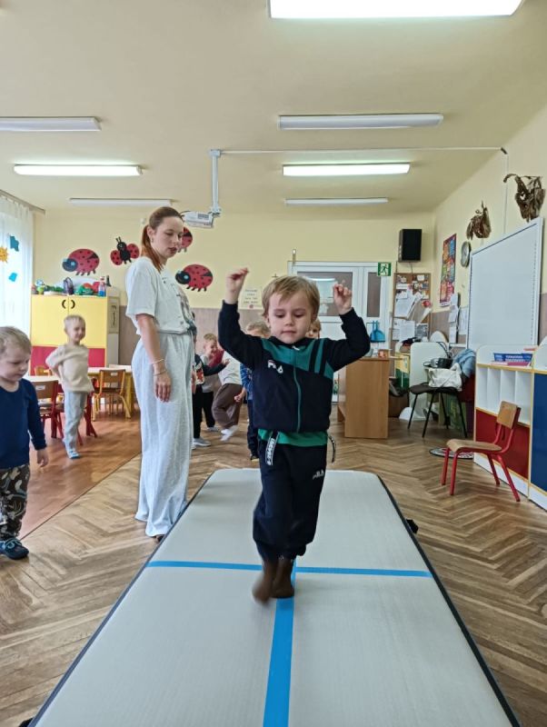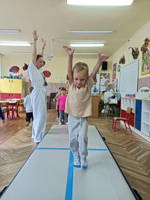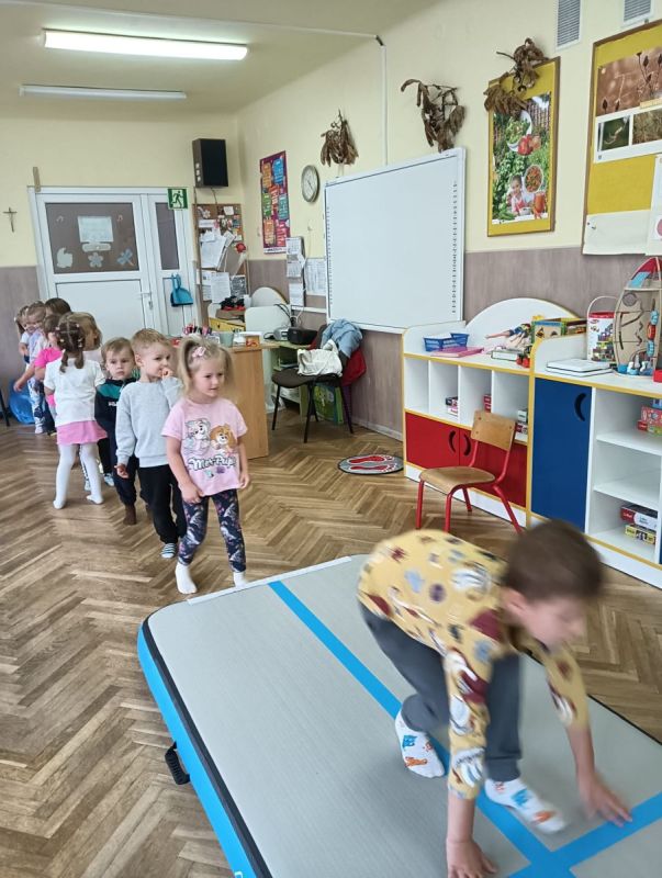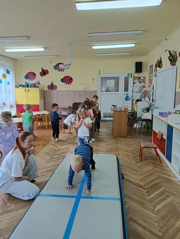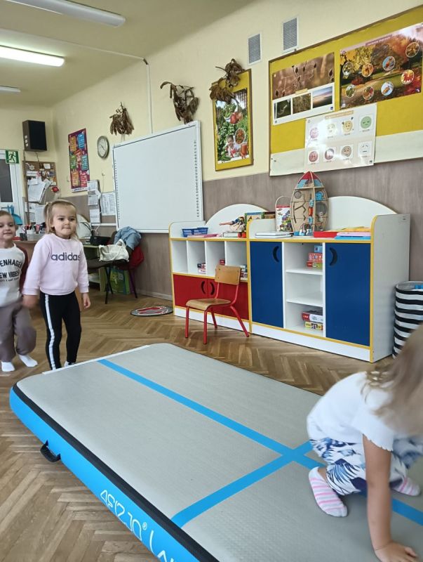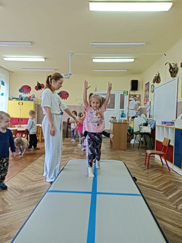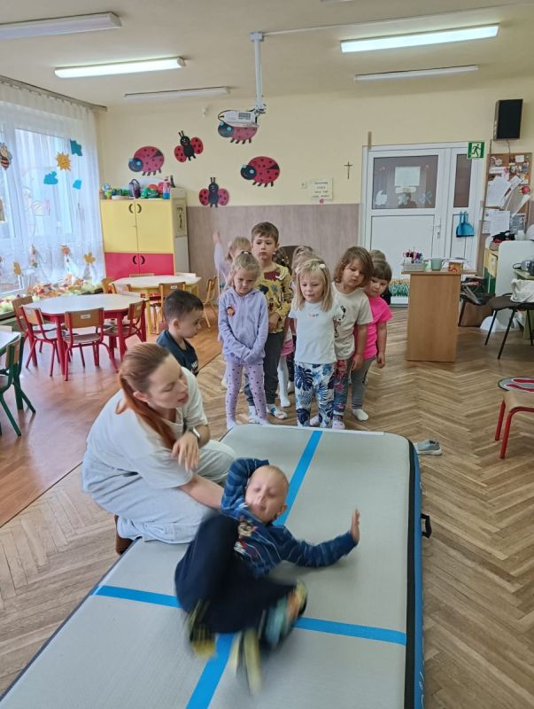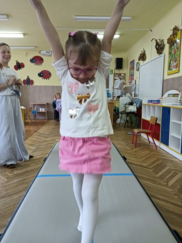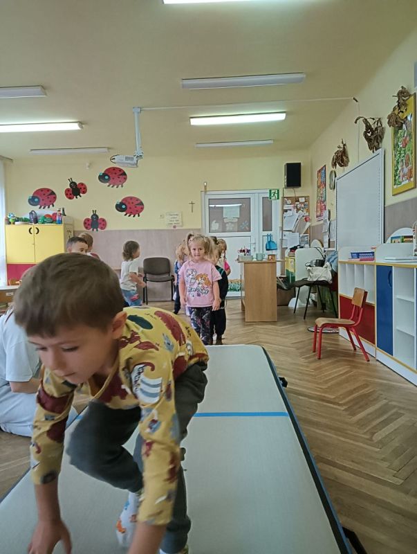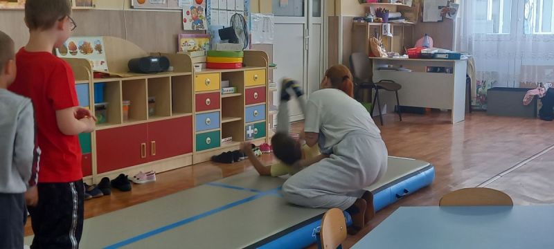 We wtorek 23.wrzesnia dzieci z przedszkola miały zajęcia pokazowe prowadzone przez profesjonalną nauczycielkę gimnastyki i akrobatyki. Dzieci poprzez zabawę na materacu przekonały się o odlotowej przyjemności z ćwiczeń gimnastycznych.