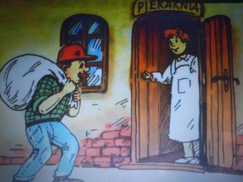 Miś nic nie odpowiedział, ale bardzo się zdziwił. „Przecież chleb robi się z mąki, a mąka jest biała, a nie zielona.” Po drodze jechał wóz. A na wozie siedział dziadek Walenty.